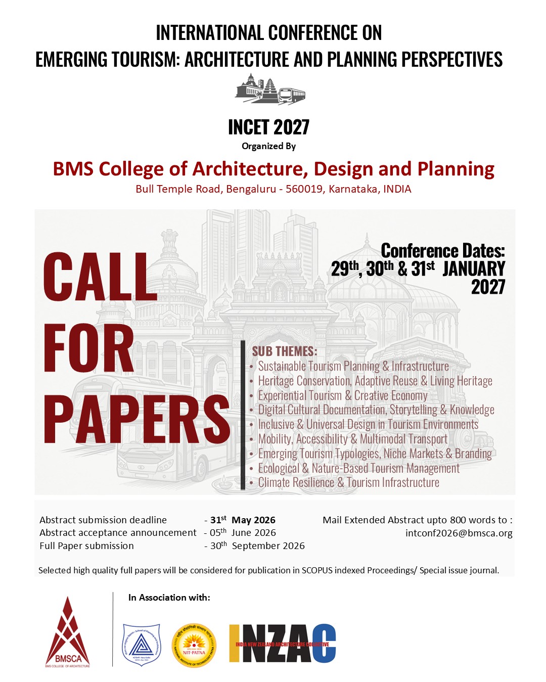 BMS College of Architecture, Design and Planning is delighted to announce the International Conference on Emerging Tourism: Architecture and Planning Perspectives (INCET 2027).