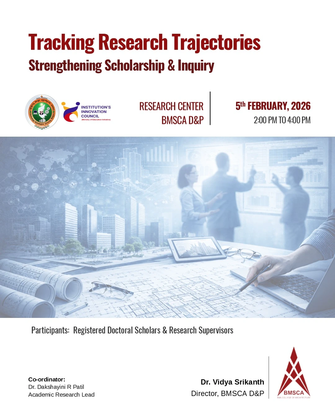 The Doctoral Programme leading to the award of the Ph.D. degree in the Faculty of Architecture commenced in 2010 as department under BMSCE. In 2017, the institution received recognition from VTU as a Research Centre.