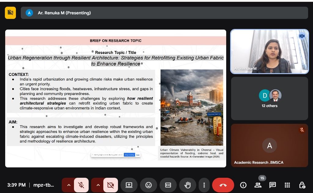 Ph D Scholar Ar. Jananee R (Asst Prof, BMSCA D &P) presenting her seminar ‘Future-Ready Urban Liveability concepts’