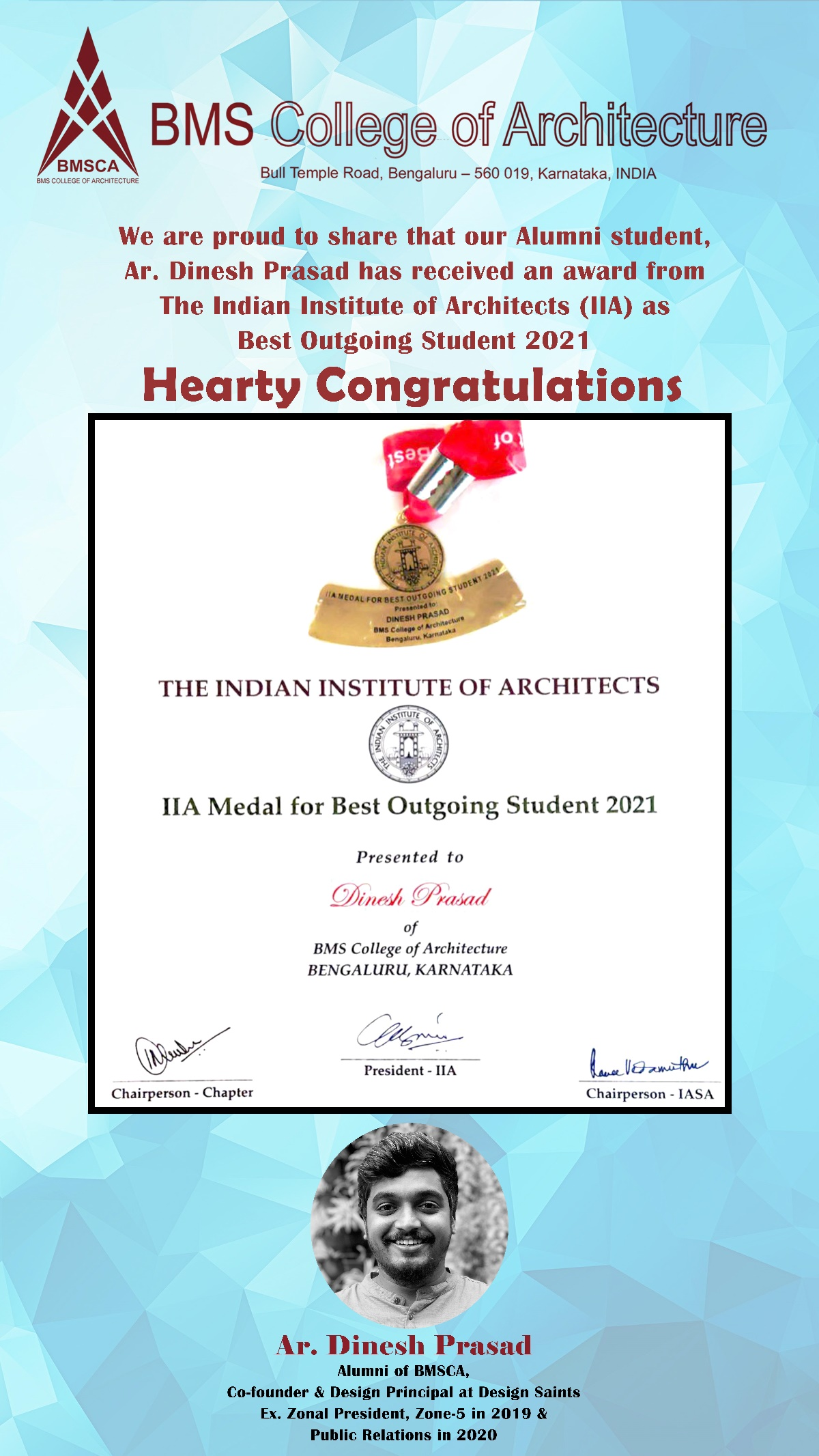Our alumini student, Ar. Dinesh Prasad has received Best Outgoing student- 2021 from The Indian Institute of Architects (IIA)