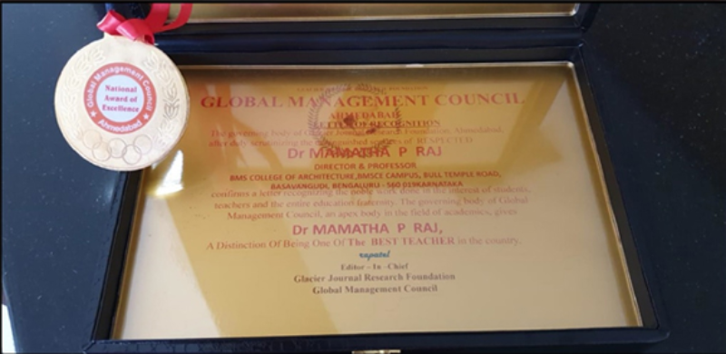 Dr. Mamatha P Raj has been awarded The Prestigious "Adarsh Vidya Saraswati Rashtriya Puraskar" by Glacier Journal Research Foundation, Global Management Council, Ahmedabad in recognition of the noble work done in the interest of students, teachers and the entire education fraternity.