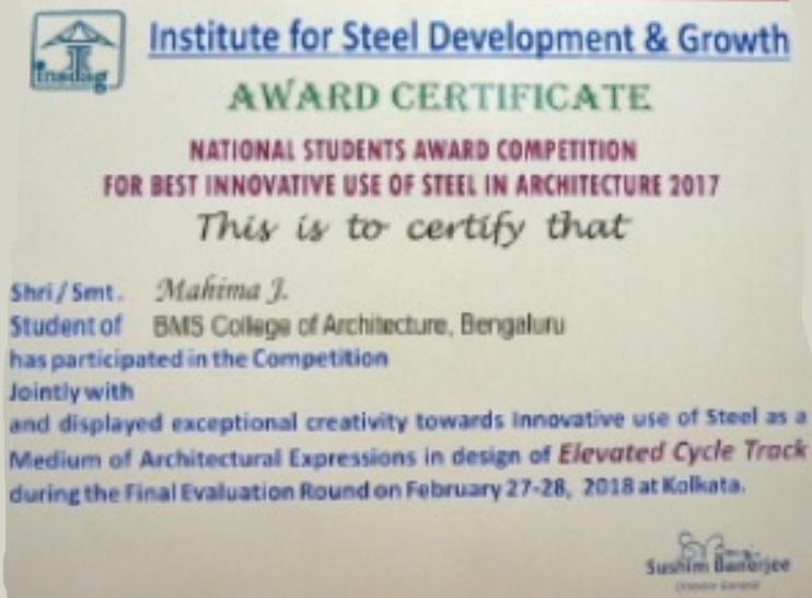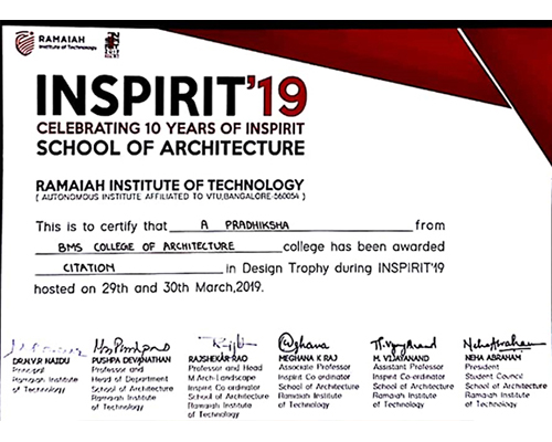 A Pradhiksha's design entry received CITATION for in Design Trophy at INSPIRIT'19, a national level event organised by School of Architecture, M S Ramaiah Institute of Technology, Bangalore held on 29 & 30 March, 2019.